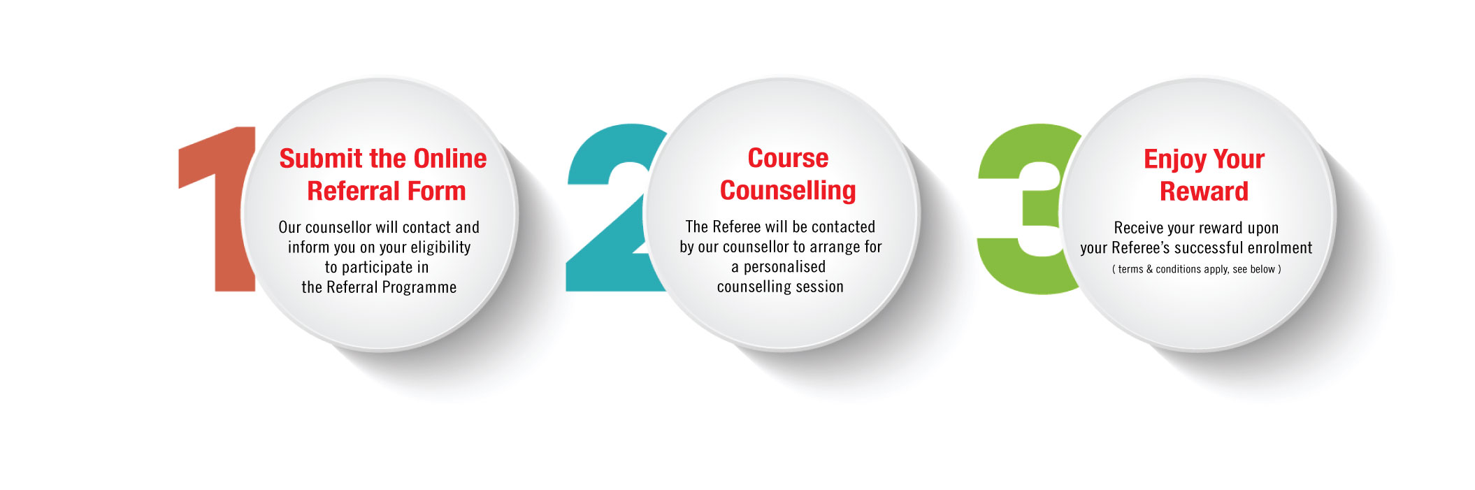 8. The referral reward will be processed within 90 working days after successful enrolment of Referee in that particular intake (no outstanding payment and attend class for more than 2 weeks).