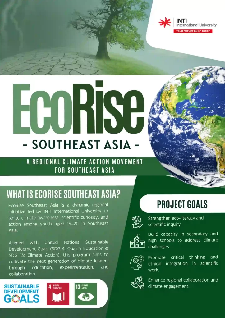 EcoRise Southeast Asia 2025 is INTI International University’s flagship regional initiative that unites students, educators, and communities across ASEAN in addressing climate change through education-driven action. Anchored in INTI’s commitment to the United Nations Sustainable Development Goals (SDGs) — particularly SDG 4 (Quality Education), SDG 13 (Climate Action), and SDG 17 (Partnerships for the Goals) — the project transforms classrooms into living laboratories for environmental impact.