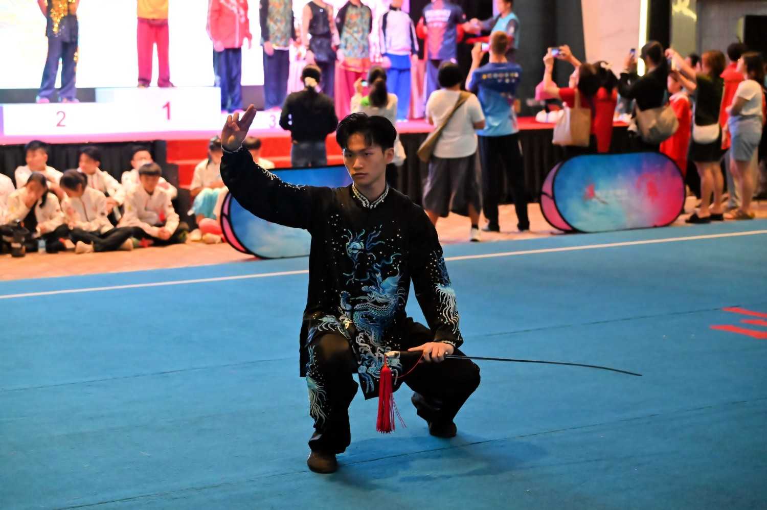 A Taiji athlete from INTI demonstrating balance and control during his sword routine.
