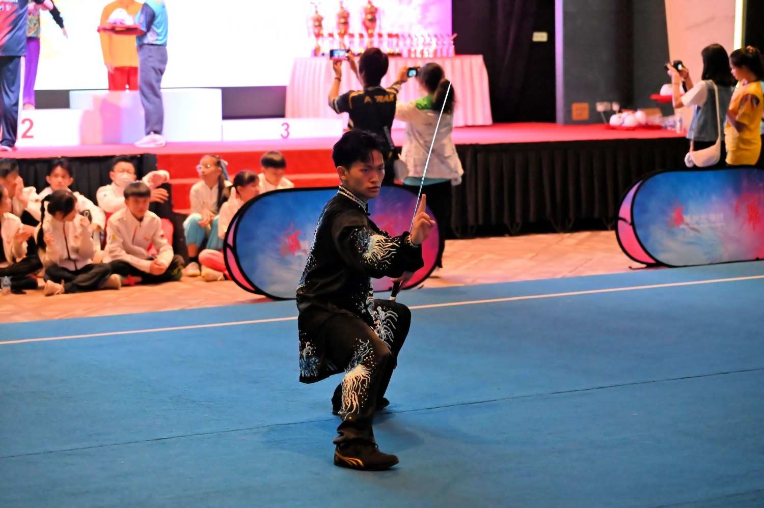 An INTI student displaying focus and discipline during a Taiji sword performance at the Ding Feng Cup 2025.