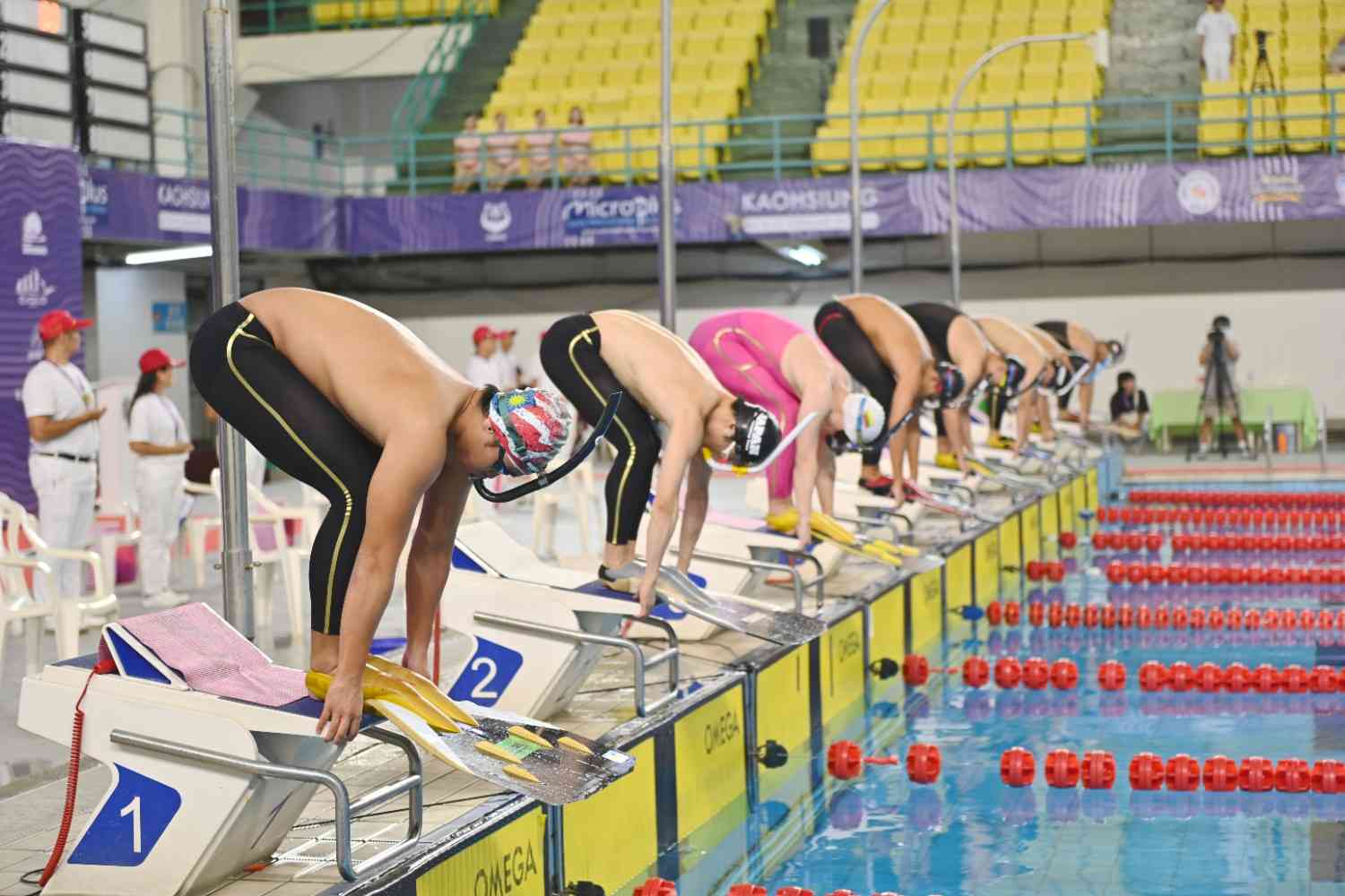 INTI Penang student Louis Chin Teng Aun (front, in national flag cap) prepares to dive at the 2025 CMAS World Cup in Kaohsiung, where he won a Silver medal in the 200m Immersion and a Bronze in the 100m Immersion.