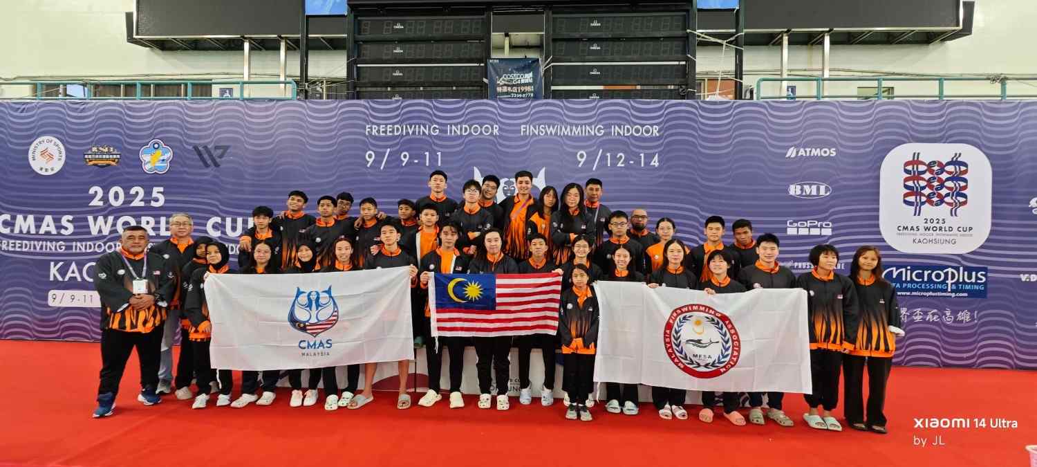 Malaysia’s finswimming team at the 2025 CMAS World Cup in Kaohsiung, featuring INTI student Louis Chin Teng Aun, who earned Silver and Bronze medals at the event.