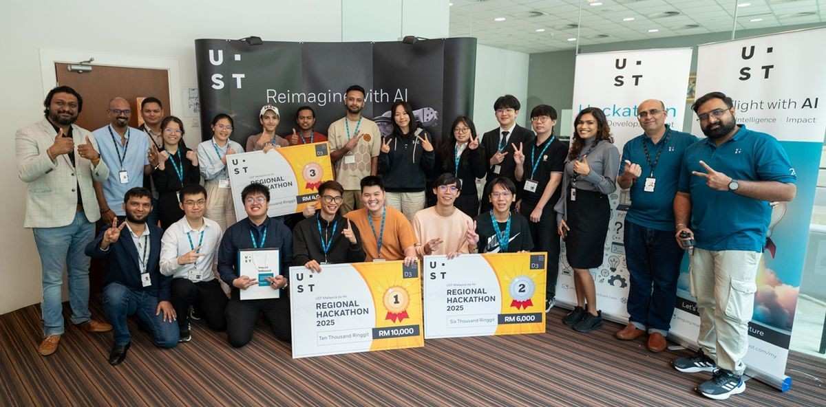 Winners and participants of the UST Global Hackathon (D3CODE 2025) Malaysia edition gather for a group photo after the results announcement